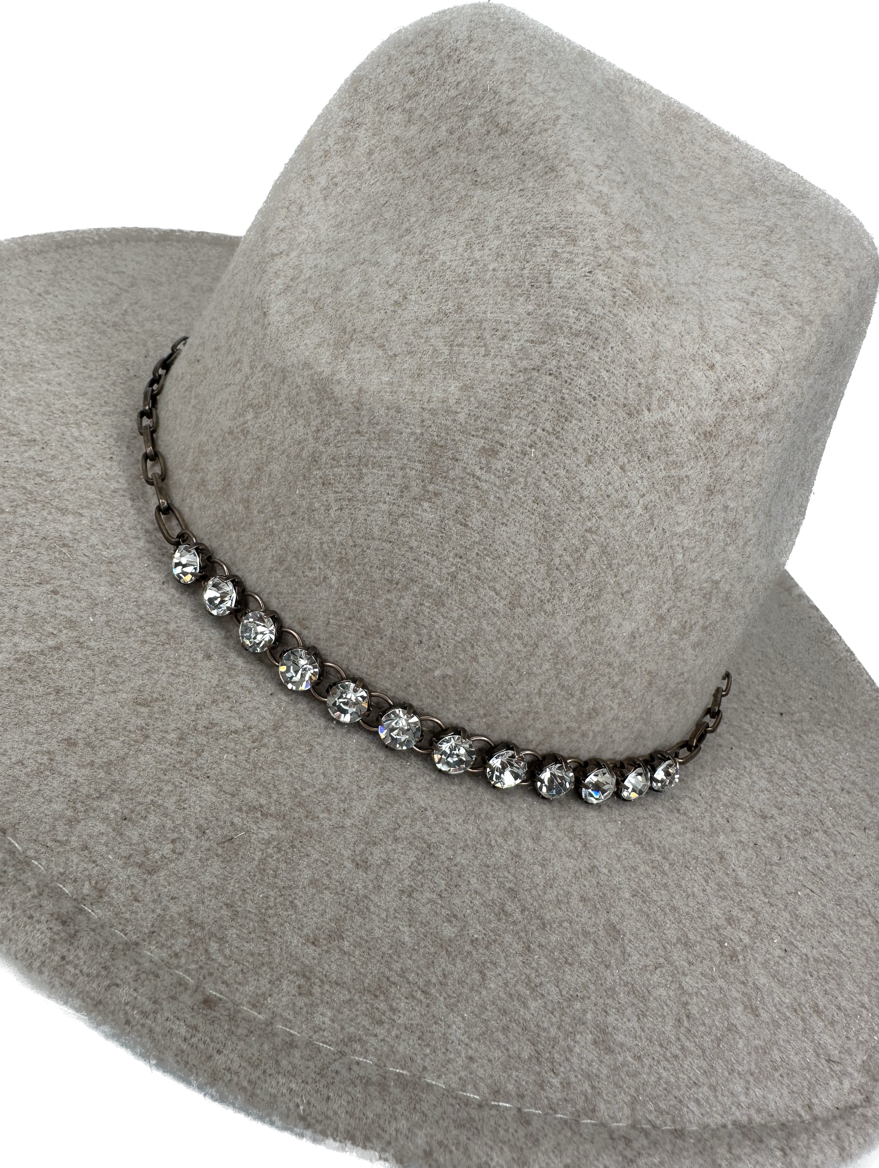 Hat bands for fedoras. Dress up your favorite hat with this black leather band. Handmade from veg-tanned leather. Sparkling crystal rhinestones with a pave pearl center accent. Beads dangle on suede tassel that you tie and adjust to your size. Once you tie it just slip it on and off. 3/4" wide.